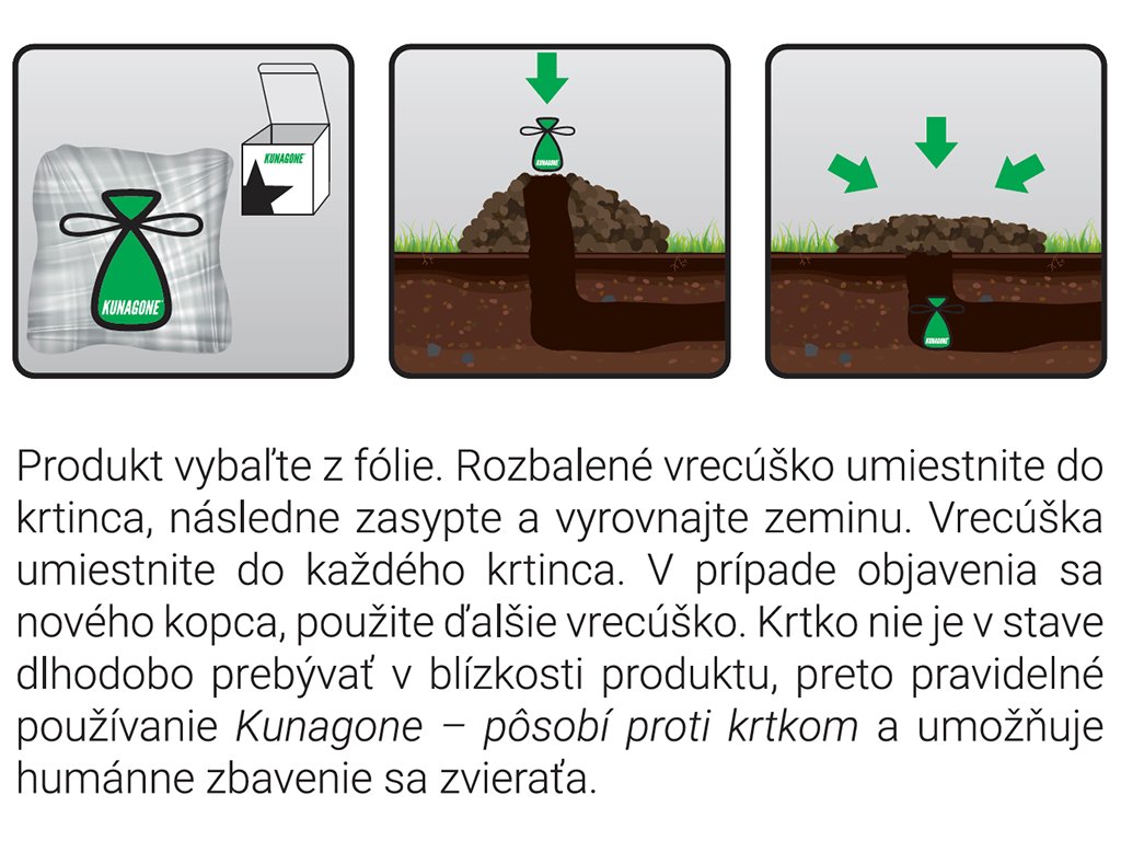 Odpudzovač stačí vybrať z vrecka, vložiť ho do diery od krtka, zahrnúť hlinou a urovnať povrch. Je vhodné vrecko vložiť hlbšie do diery, aby sa k nemu nedostali deti alebo domáce zvieratá.