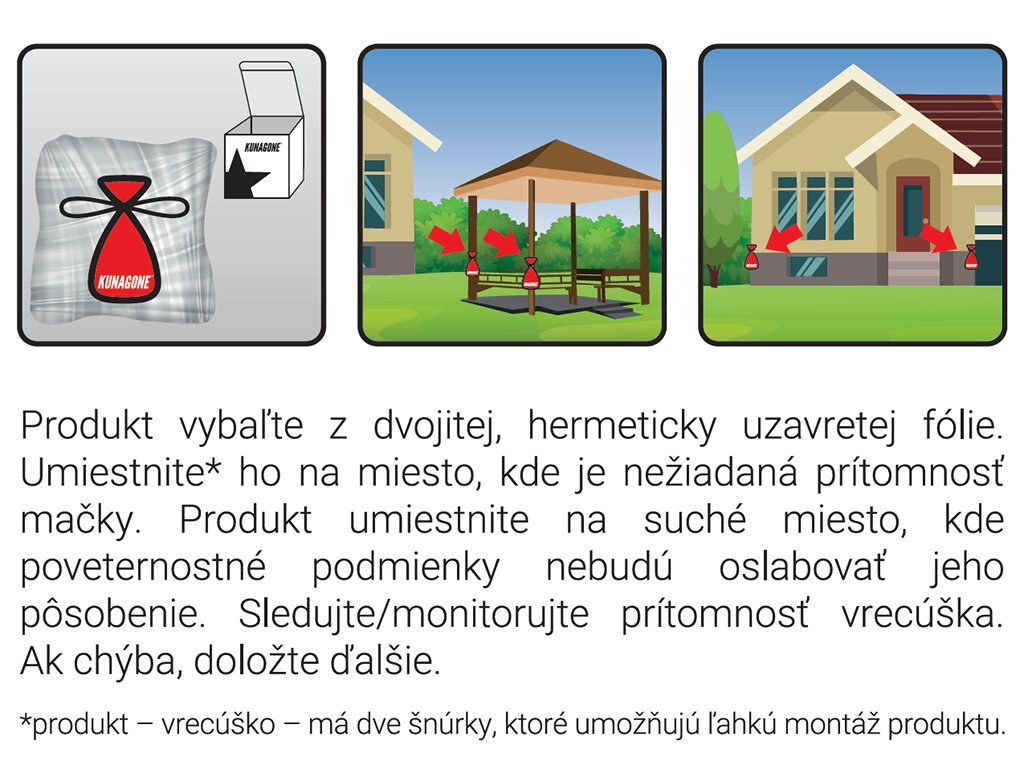 Odpudzovač stačí vybrať z vrecka a potom ho jednoducho zavesíte do Vami vybraného priestoru, tak aby ste zabránili prístupu detí a iných zvierat. Dbajte tiež na poveternostné podmienky, aby sa neznižovala účinnosť cez odviatie pachu vetrom.